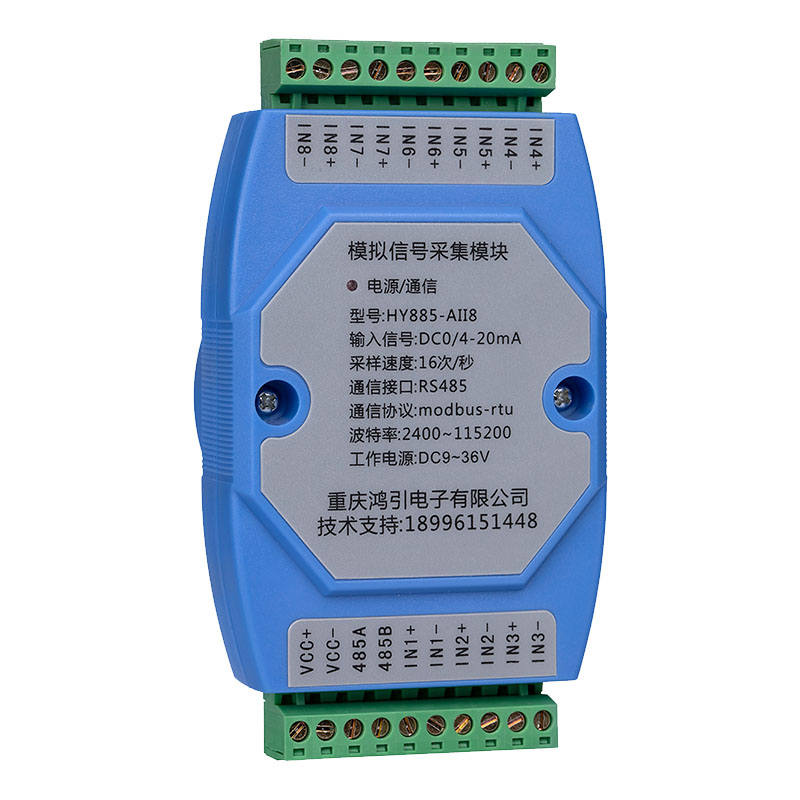 采用進口16位模數轉換芯片,把8路DC0~20mA模擬信號轉換成數字信號,通過RS485接口輸出,DC0~20mA輸入對應的數字量為0-20000,最高可測到DC24mA。DC0~20mA模擬信號輸入與工作電源、RS485之間隔離。RS485通信采用標準Modbus-rtu協議,可與各種組態軟件、PLC、觸摸屏聯網。出廠預設RS485通信參數:模塊地址1,波特率9600,8個數據位,無校驗位,1位停止位,用戶通過上位機參數設置軟件修改通信參數。