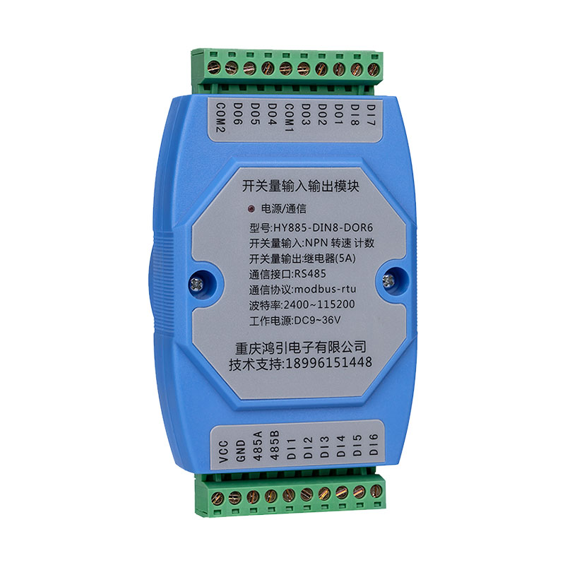 8路開關量輸入,干接點輸入,6路繼電器輸出。8路開關量輸入,每路都帶計數功能,計數值帶掉電保存功能,掉電不丟失;第1、2路輸入可選接編碼器輸入(方向自動識別,加減計數)或普通輸入;每路輸入都帶濾波功能,濾波時間可設(可有效防止按鍵,繼電器這種有抖動的輸入誤計數問題)。第1路開關量輸入,帶轉速測量功能。繼電器輸出有電平輸出模式和脈沖輸出模式,脈沖輸出模式的脈沖時間可設。RS485采用標準modbus-rtu協議,可與各種組態軟件、PLC、觸摸屏聯網。出廠預設RS485通信參數:模塊地址1,波特率9600,8個數據位,無校驗位,1位停止位,用戶通過上位機參數設置軟件修改通信參數。