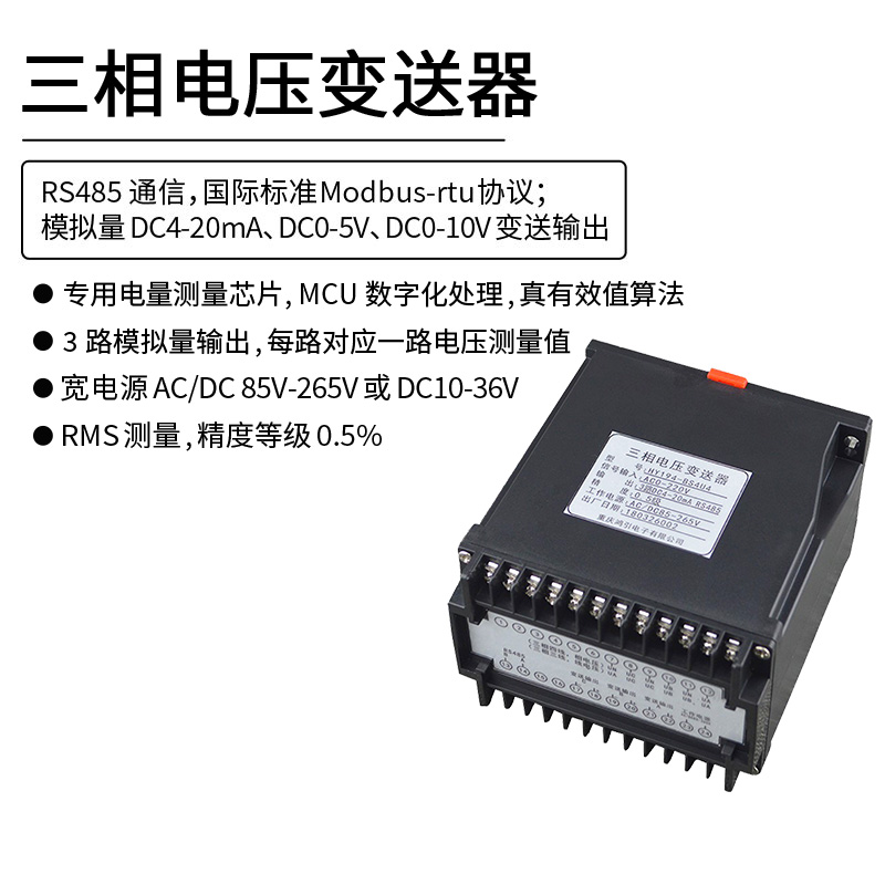 三相電壓變送器,通過專用電量芯片采樣,CPU 數字化處理,真有效值算法,高精度的測量三相電壓,隔離轉換成線性直流標準模擬信號輸出或RS485數字通信接口輸出。模擬量可選:DC0~20mA、DC4~20mA、DC0~5V、DC1~5V、DC0~10V等變送輸出;RS485數字通信接口,采用國際標準Modbus-rtu通信協議,可與各種PLC、HMI、組態軟件實現組網。