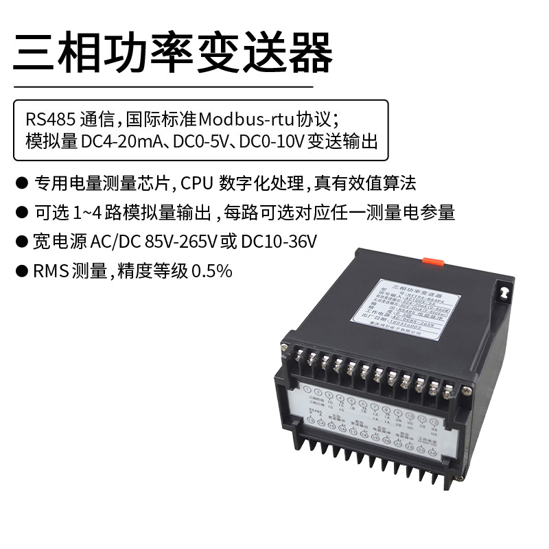 三相功率變送器,通過專用電量芯片采樣,CPU 數字化處理,真有效值算法,高精度的測量有功功率、無功功率、視在功率、功率因數、三相電壓、三相電流、頻率、有功電能、無功電能等,隔離轉換成線性直流標準模擬信號輸出、RS485數字通信接口輸出或電能脈沖輸出。模擬量可選:DC0~20mA、DC4~20mA、DC0~5V、DC0~10V等變送輸出;RS485數字通信接口,采用國際標準Modbus-rtu通訊協議,可與各種PLC、HMI、組態軟件實現組網。最多可選4路模擬量輸出,每路可選對應上面任意一種電參量。有功電能脈沖,無功電能脈沖輸出,脈沖常數300~9999可設。
