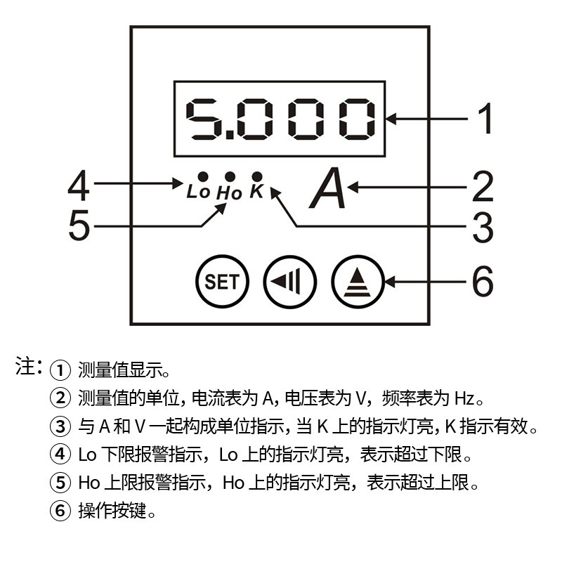 ③、與A和V一起構成單位指示,當K上的指示燈亮亮,代表K指示有效。