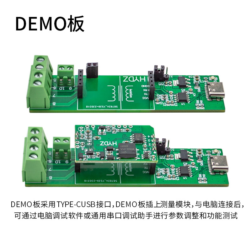 DEMO板采用TYPE-C USB接口,DEMO板插上測量模塊,與電腦連接后,可以直接在電腦上用我們的調(diào)試軟件或用通用的串口調(diào)試助手進行模塊的參數(shù)調(diào)整和功能測試。